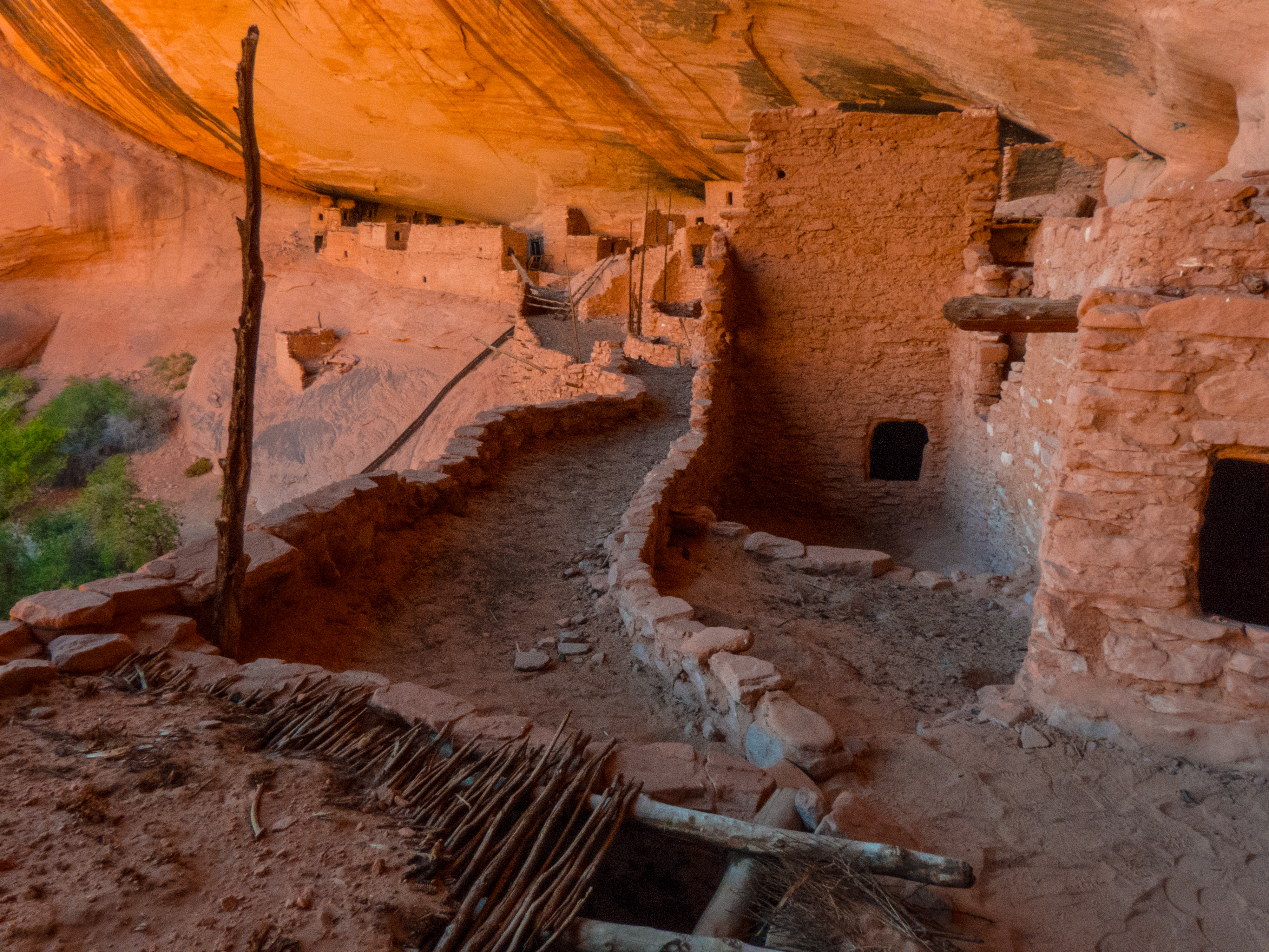 People began settling in Keet Seel around A.D. 950. In A.D. 1250, a new group of settlers arrived and a steady influx kept the village growing until it contained more than 150 rooms. Part of the ruins are closed – these are the unrestored ruins – much of it is intact and well preserved. You look down main street and see may homes with windows facing the street line this path. Each house seems to be built at different times, slightly varying in style and details, there are tall poles that line this path – perhaps birds / animals were tethered to these?, were they used for hanging things one wonders… some walls are masonry and others are “wattle and daub” construction.